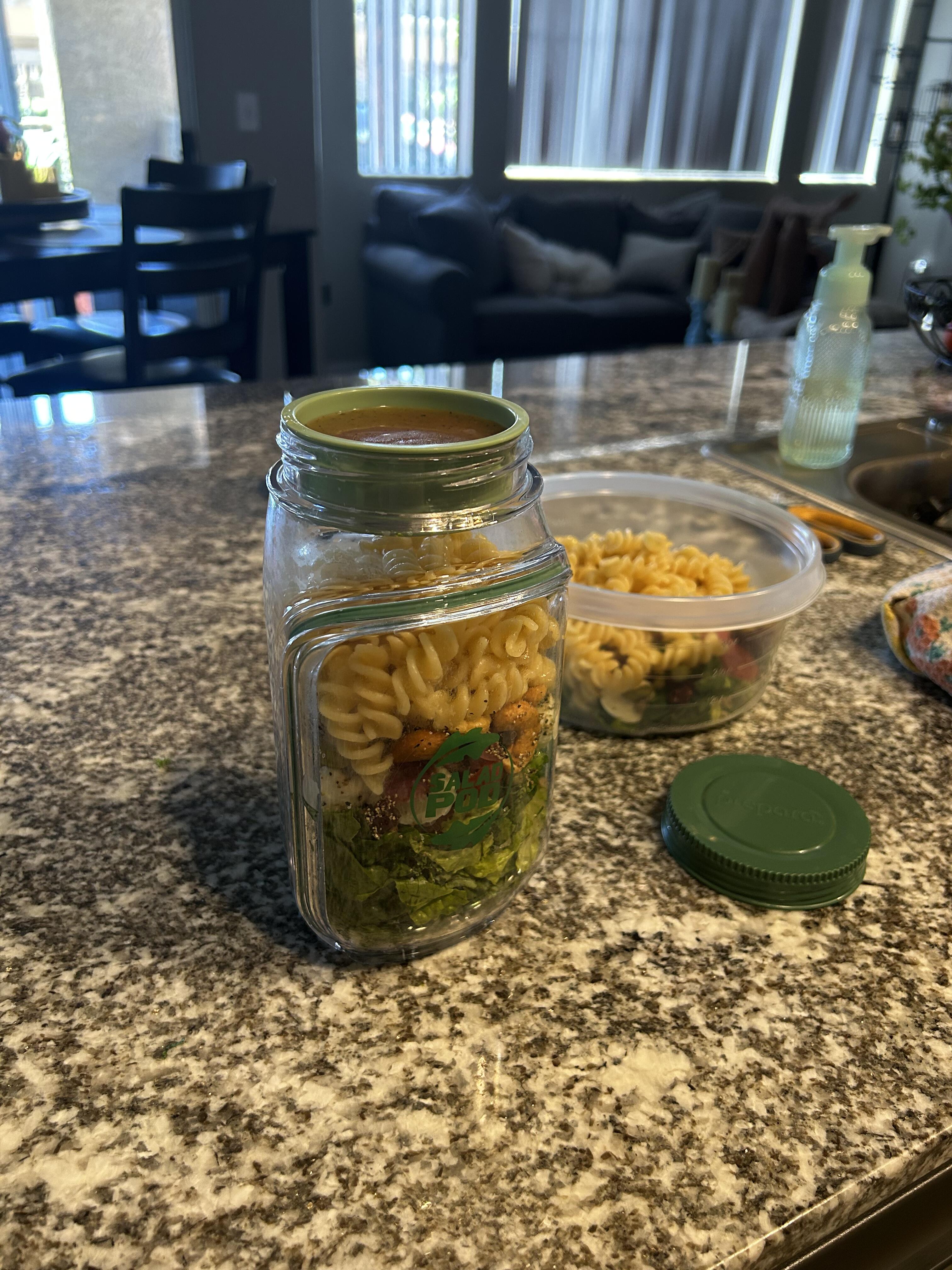 Literally just fill it up with your favorite greens and veggies, add some dressing on the top and throw it in your bag! Best purchase ever.